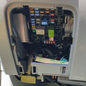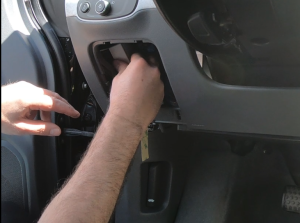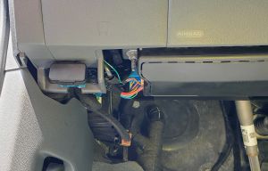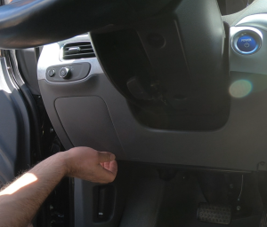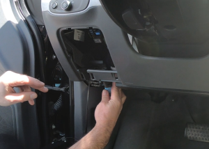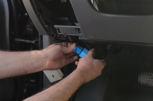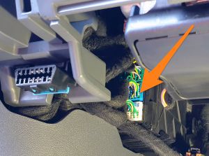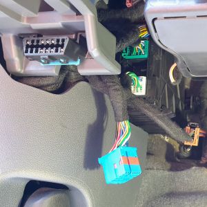 Entriegeln Sie den unteren, blauen Stecker und ziehen Sie ihn aus dem Verbindungsblock, der sich unter dem Armaturenbrett befindet.